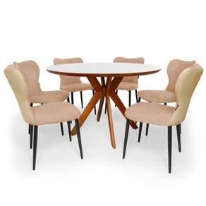 Cor: Bege | Fabricante: Magazine Decor | Quantidade de Lugares: 6 | Peso do Produto: 50 | Largura: 100 | Produto: Mesa e Cadeiras | Altura: 78 | Tonalidade: Bege | Tipo de Conjunto: Mesa e Cadeiras | Áreas Indicadas: Cozinha | Coleção Jardim: Não | Uso Indicado do Móvel: Mesa de Jantar | do modelo: 1 | Exige montagem: Sim | Baterias são necessárias?: Não | Certificação de teste externa: Não | Is Fragile: Não | de caixas: 2 | da peça: 1 | Peso do item: 50 | Principais Características do Produto (bullet_point#0): Apresentamos a Mesa de Jantar Redonda Marci Premium com as Cadeiras Jacobsen, um elegante e sofisticado móvel que trará um toque de estilo e funcionalidade para a sua sala de jantar! | Principais Características do Produto (bullet_point#1): A Mesa Marci possui um diâmetro de 120cm, tamanho ideal para acomodar confortavelmente até 6 pessoas, proporcionando um ambiente acolhedor e intimista. | Principais Características do Produto (bullet_point#2): A Cadeira de Jantar Estofada Jacobsen é a escolha perfeita para quem busca aliar elegância, conforto e versatilidade. | Componentes incluídos: 1 Mesa + 6 Cadeiras | Quantidade de itens: 7 | Dimensões do item P x L x A: 78x100x100