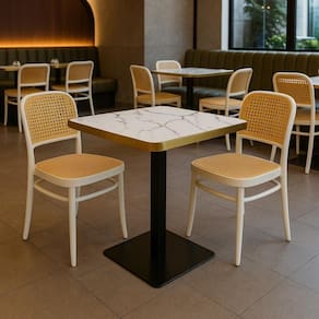 A mesa possui um tampo em mármore sintético, que confere um toque de luxo e requinte, além de ser fácil de limpar e resistente ao uso diário. Sua base em metal oferece excelente estabilidade e , enquanto as bordas metálicas do tampo complementam o visual contemporâneo, trazendo um acabamento refinado e duradouro.
