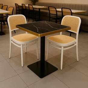 A mesa possui um tampo em mármore sintético, que confere um toque de luxo e requinte, além de ser fácil de limpar e resistente ao uso diário. Sua base em metal oferece excelente estabilidade e , enquanto as bordas metálicas do tampo complementam o visual contemporâneo, trazendo um acabamento refinado e duradouro.