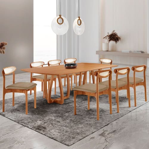 Para completar o conjunto, a Cadeira Mônaco Premium oferece conforto e sofisticação. Seu encosto foi projetado para proporcionar melhor ergonomia, enquanto o assento estofado garante mais comodidade durante as refeições e encontros com família e amigos. O acabamento cuidadoso e os materiais de qualidade reforçam o estilo elegante do conjunto. Medida da Mesa (A x L x P): 240x110x80cm Peso da Mesa: 87,4 kg Mesa suporta até: 40 kg Acabamento da Cadeira/Banco: Pintura UV Acabamento da Mesa: Pintura UV Almofada do assento: Fixa Ambiente Principal: Sala de Jantar Cadeira/Banco Estofada: Somente Assento Estofado Cadeira/Banco estofada: Somente Assento Estofado Cadeira/Banco suporta até: 140 kg Cadeira/Banco Suporta Até: 140.0000 codigo_ean: 7900288352293 Complexidade da Montagem: Média: pode ser montado por mais de uma pessoa e/ou necessite de maior conhecimento para montagem Configuração do Conjunto: Mesa com Cadeiras Cor: Cinamomo/Turim Cor da Base: Natural Cor das Cadeiras: Marrom Cor do Produto: Cinamomo/Turim Cor do Tampo: Natural Cor Flex: Não Cor Secundária: Marrom De Canto (Canto Alemão): Não Escala de Brilho: Semi-Brilho Espessura do Tampo: 40 mm Estrutura do Assento: Madeira Maciça Formato do Tampo: Retangular Informações Complementares: As cadeiras são entregues totalmente montadas e prontas para uso, enquanto a mesa chega pré-montada, facilitando a instalação e garantindo praticidade. Itens Inclusos: 1 Mesa, 8 Cadeiras e Kit Ferragens Linha ou Coleção: Ello/Mônaco Premium Manual de Montagem e Instalação: https://product-hub-prd.madeiramadeira.com.br/529428165/documents/d5ee18bd-36f8-45f0-8ade-bebb34d65aa9343575658441773056258677.pdf Marca: Mobilare Material da Base da Mesa: MDF Laminado/Madeira Maciça Material da Estrutura da Cadeira: Madeira Maciça Material do Tampo: Laminado Material Principal: Madeira Maciça/MDF Material Principal das Cadeiras/Bancos: Madeira Maciça Medida da Cadeira/Banco (A x L x P): 86x48x53cm Medida do Tampo (L x C x E): 240x110x4cm Mesa Dobrável: Não Mesa Extensível: Não Montagem Flex: Não Necessita Montagem: Sim Origem do Produto: Nacional Peso da Cadeira/Banco: 5,7 kg Possui Apoio para Braços: Não Possui Apoio Para os Pés: Não Possui Prateleiras: Não Possui Vidro: Não Quantidade de Cadeiras: 8 Quantidade de Lugares: 08 Recomendações de Uso, Manutenção e Limpeza: Limpar com pano seco Sistema de Montagem: Parafusos Tipo de Assento: Fixo Tipo de Encosto: Fixo