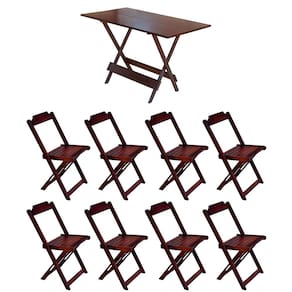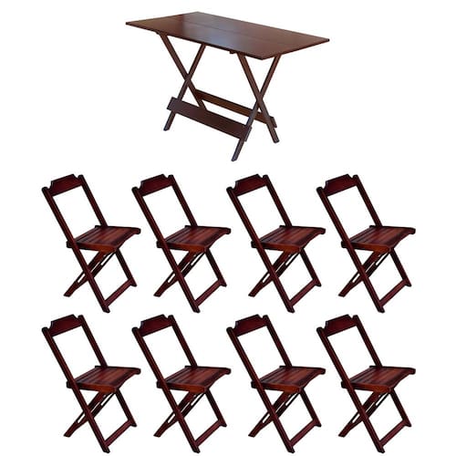 Conjunto Mesa De Madeira Dobravel 120x70 Imbuia 8 Cadeiras é ideal para bares, restaurantes, estabelecimentos, áreas de lazer e tambem para sua casa. Feito em madeira maciça, tornando resistentes e duráveis. Seu design permite que seja encaixado em qualquer ambiente, trazendo um toque a mais para seu estabelecimento. Além de sua durabilidade, o que lhe trará conforto para servir seus clientes. Por ser dobrável torna-se mais fácil guardar, manusear e limpar o produto. Atenção: EVITE USAR PRODUTOS ABRASIVOS E QUíMICOS PARA LIMPEZA DO PRODUTO, aconselha-se o uso de pano umedecido para melhor conservação; mantenha o produto fora de chuva e sol constantes. MESA Cor: Imbuia Modelo: Dobravel Dimensões: Altura 75cm | Largura 70cm | Profundidade 120cm CADEIRA Cor: Imbuia Modelo: Dobravel Dimensões: Altura 80cm | Largura 45cm | Profundidade 42cm