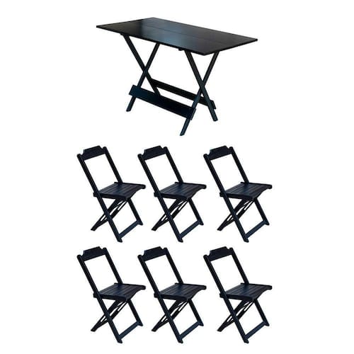 Conjunto Mesa De Madeira Dobravel 120x70 Preto 6 Cadeirasé ideal para bares, restaurantes, estabelecimentos, áreas de lazer e tambem para sua casa. Feito em madeira maciça, tornando resistentes e duráveis. Seu design permite que seja encaixado em qualquer ambiente, trazendo um toque a mais para seu estabelecimento. Além de sua durabilidade, o que lhe trará conforto para servir seus clientes. Por ser dobrável torna-se mais fácil guardar, manusear e limpar o produto.Atenção: EVITE USAR PRODUTOS ABRASIVOS E QUíMICOS PARA LIMPEZA DO PRODUTO, aconselha-se o uso de pano umedecido para melhor conservação; mantenha o produto fora de chuva e sol constantes.MESA Cor: Preto Modelo: Dobravel Dimensões: Altura 75 | Largura 70 | Profundidade 120CADEIRA Cor: Preto Modelo: Dobravel Dimensões: Altura 80 | Largura 45 | Profundidade 42Conjunto Mesa de Madeira Dobravel 120x70 Preto 6 Cadeiras Marca: Preguiçosa