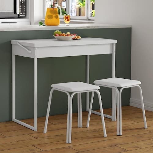 O Conjunto Sala de Jantar é composto por uma mesa dobrável e duas banquetas. Ideal para quem busca um produto funcional e que evite ocupar muito espaço. Sua mesa permite acomodar dois lugares quando fechada e até quatro quando aberta. As duas unidades da banqueta podem ser armazenadas embaixo da mesa ou armazenadas empilhadas, otimizando a área de circulação e o armazenamento do ambiente.