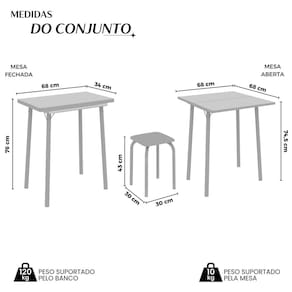 Este conjunto prático e versátil é ideal para otimizar o aproveitamento de espaço em sua casa. A mesa dobrável possui um design inovador que permite ajustar o tamanho do tampo, podendo ser utilizada em dois formatos: aberto e fechado, oferecendo flexibilidade conforme a necessidade. Acompanhada de quatro banquetas empilháveis, que economizam espaço e são fáceis de armazenar, este conjunto proporciona conforto e praticidade. Medida da Mesa (A x L x P): Aberta: 74,5 x 68 x 68 cm / Fechada: 76 x 34 x 68 cm Peso da Mesa: 10,5 kg Mesa suporta até: 10 kg Acabamento da Cadeira/Banco: Pintura Texturizada Acabamento da Mesa: Melamínico Ambiente Principal: Cozinha Cadeira/Banco estofada: Somente Assento Estofado Cadeira/Banco suporta até: 120 kg Complexidade da Montagem: Baixa: pode ser montado por uma pessoa sozinha Cor: Creme / Branco Cor do Produto: Creme / Branco Escala de Brilho: Semi-Fosco Espessura do Tampo: 15 mm Estrutura do Assento: MDP de 15mm, espuma 1,2mm, courino. Itens Inclusos: 1 Mesa dobrável, 4 Bancos, manual de montagem e Kit Ferragem. Manual de Montagem e Instalação: https://product-hub-prd.madeiramadeira.com.br/921983/documents/b2d706f0-5898-48d3-9de7-fa042e9b1cde2130466352817204642801622.pdf Material da Base da Mesa: Aço Material da Estrutura da Cadeira: Aço Material do Tampo: MDP Medida da Cadeira/Banco (A x L x P): 43 x 70 x 70 cm Medida do Tampo (L x C x E): Aberta: 68 x 68 x 1,5 cm / Fechada: 34 x 68 x 3 cm Necessita Montagem: Sim Origem do Produto: Nacional Peso da Cadeira/Banco: 1,5 kg Possui Apoio Para os Pés: Não Quantidade de Lugares: 04 Recomendações de Uso, Manutenção e Limpeza: Usar um pano de tecido macio e seco, evitar detergentes, alvejantes e produtos químicos de limpeza; no tampo usar tecido macio levemente umedecido. Sistema de Montagem: PARAFUSOS