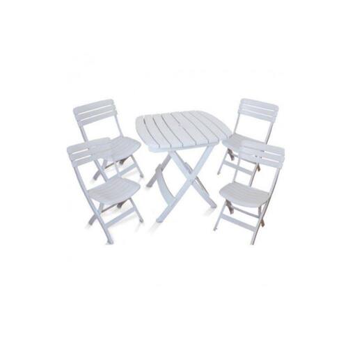 O produto é fácil de transportar, limpar e ocupa pouco espaço. CARACTERÍSTICAS . mesa dobrável ripada . cadeiras dobráveis ripada . cor branco . cadeira suporta até 90 Kg . prático para guardar . leve para carregar . fácil transporte . limpeza feita com água e sabão neutro com esponja ou tecido