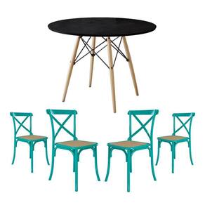 Conjunto De Mesa Eiffel Redondo Tampo De Madeira 110cm Preto Com 4 Cadeiras Katrina em Aço Azul Turquesa Assento BegeA sua cozinha ou sala de jantar ficará completa com esse lindo Conjunto de Mesa e Cadeiras! Contendo um design de móveis moderno, elegante e com uma ousada combinação de cores, esse é um kit que certamente é uma solução que esbanja estilo, elegância e muito requinte.O conjunto tem em sua diversificada estrutura de materiais com altíssima qualidade, que proporciona muito mais resistência, mesmo com o passar dos anos, e com seus 4 assentos Katrina Aço é ideal para um jantar em família sem abrir mão do conforto. O Kit acompanha versatilidade e combina com vários tipos de decoração, o que dá mais praticidade em sua casa.Informações técnicas Conjunto:Conteúdo da Embalagem: 01 Mesa e 04 Cadeiras (Embalados Separadamente).Instruções/Cuidados: Limpar com pano seco ou levemente umedecido com água.Necessita de Montagem? Sim.Mesa:Modelo: Eiffel WoodTipo: RedondaCor do tampo: PretoCor da base dos pés: Wood (Madeira)Material do tampo: MadeiraMaterial dos pés: MadeiraDimensões: Altura: 76 cm // Largura: 110 cm // Profundidade: 110 cmCadeiras:Modelo: KatrinaCor: Azul Turquesa e BegeMaterial da estrutura: Aço com Pintura E-PoxMaterial do assento: Espuma D14 com Revestimento em Corano.Dimensões: Altura: 90 cm // Largura: 50 cm // Profundidade: 55 cmConjunto Mesa Eiffel Redondo de Madeira 110cm Preto com 4 Cadeiras Katrina Azul Turquesa Assento Beg