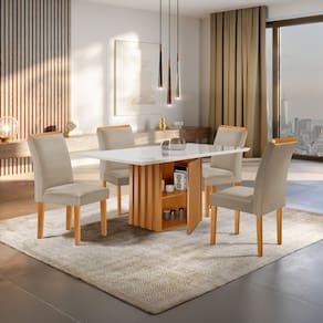 O Conjunto Mesa Elis 120cm x 90cm com 4 Cadeiras Luisa combina design sofisticado e praticidade para transformar sua sala de jantar. O tampo Slim Plus com vidro Off White adiciona um toque moderno e facilita a limpeza, tornando o dia a dia mais prático. As Cadeiras Luisa, com design elegante e ergonomia aprimorada, garantem máximo conforto para refeições prolongadas. Compacto e versátil, esse conjunto se adapta bem a diferentes estilos de decoração.