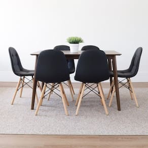 A Mesa Finlândia em madeira é ideal para quem busca elegância e praticidade, seu design rústico garante o detalhe que falta na decoração da sua casa. O conjunto com 6 cadeiras Eiffel Botonê completa o kit e garante o custo benefício para transformar o estilo divertido da sua casa com muita praticidade e toques de design. Conjunto composto por: uma Mesa com tampo em MDF de 19 mm, base em madeira seringueira + 6 cadeiras com assento revestido em PU, Base em madeira faia com armação em aço pintado. Possui Rodízio: Não Altura do Conjunto: 82 cm Ambiente: null Ambiente Principal: Sala de Jantar Cor: Preto/Nogueira Informação Complementar: 1x Mesa de Jantar Retangular Tampo MDF Finlândia NogueiraLargura: 120 cmAltura: 75 cmPeso: 19 kgProfundidade: 75 cmNecessita Montagem: Sim1x Conjunto 6 Cadeiras Botone Eiffel PretoLargura: 45 cmAltura: 82 cmPeso: 4,1 kgProfundidade: 50 cmNecessita Montagem: Sim Tamanho: