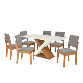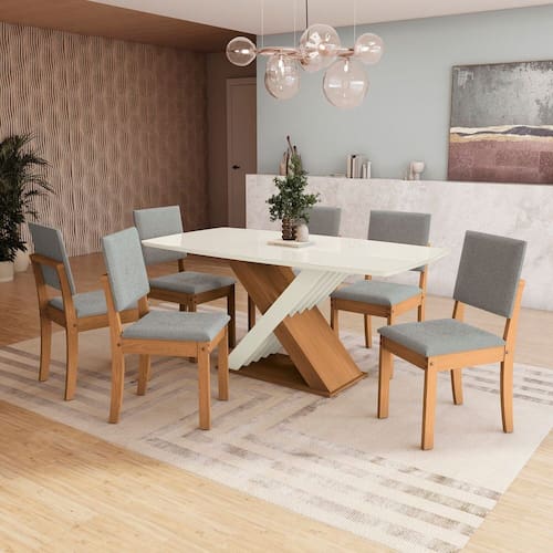 Sua Sala de Jantar mais completa com a linha Kappesberg. A mesa é em MDP, e com pintura touch na cor canela e fosca na cor off white, conta com design moderno. Com travessas em X, ela será o destaque da sua sala de jantar, e quando combinada ao tampo retangular, ela acomoda até seis pessoas. Resistente e em MDF, o tampo é na cor off white, e os destaques ficam por conta do vidro e as bordas ovais. Medindo 170cm X 90cm e espessura de 30mm, ele suporta até 90kg. Já as cadeiras, em MDF, contam com 93,5cm de altura, sendo 50cm a altura do assento, 42cm de largura e 54cm de profundidade, e pintura touch na cor canela, suportando até 120kg. Desmontada, tanto o encosto quanto o assento são estofados e recobertos com tecido bouclé cinza, garantindo conforto em todos os momentos.