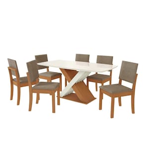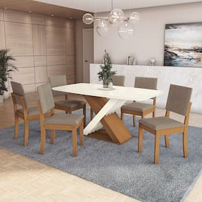 Sua Sala de Jantar mais completa com a linha Kappesberg. A mesa é em MDP, e com pintura touch na cor canela e fosca na cor off white, conta com design moderno. Com travessas em X, ela será o destaque da sua sala de jantar, e quando combinada ao tampo retangular, ela acomoda até seis pessoas. Resistente e em MDF, o tampo é na cor off white, e os destaques ficam por conta do vidro e as bordas ovais. Medindo 170cm X 90cm e espessura de 30cm, ele suporta até 90kg. Já as cadeiras, em MDF, contam com 93,5cm de altura, sendo 50cm a altura do assento, 42cm de largura e 54cm de profundidade, e pintura touch na cor canela, suportando até 120kg. Desmontada, tanto o encosto quanto o assento são estofados e recobertos com tecido bouclé cinza, garantindo conforto em todos os momentos.
