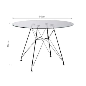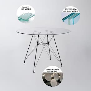 Conjunto Mesa Jantar Eames Eiffel 90cm Redonda Vidro Com 4 Cadeiras Pretas Base Ferro PretoA Mesa Eiffel é a escolha ideal para deixar sua casa muito mais bonita e renovada. Essa mesa tem em sua estrutura materiais de altíssima qualidade, que proporciona muito mais resistência, mesmo com o passar dos anos. Ela tem formato redondo e possui espaço para 4 lugares, o que é ideal para um jantar em família. A mesa é versátil e combina com vários tipos de decoração, o que dá mais praticidade em casa.Tipo: MesaModelo: EiffelCor: Tampo Redondo Branco / PretoDimensões do Produto- Altura: 76cm- Diâmetro:Características- Base: Madeira com ferro entrelaçado preto / branco / cobre- Tampo de Vidro / Madeira (mdp) com espessura de 25mm- Necessita Montagem? Parcialmente (Produto Entregue Montado Parcialmente)