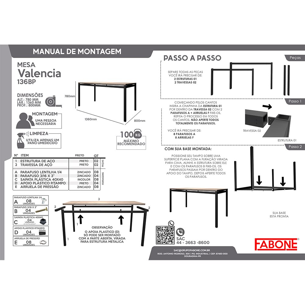 A mesa retangular com tampo em MDP de 30 mm possui estrutura em aço carbono com pintura eletrostática, garantindo resistência e durabilidade. Com medidas de 136x80 cm, acomoda confortavelmente 6 pessoas e suporta até 80 kg.