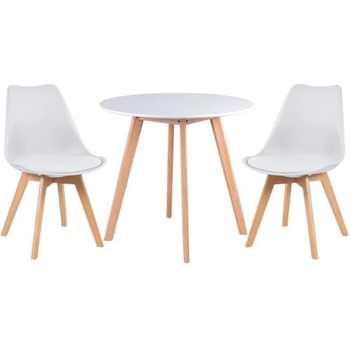 Conjunto Mesa Jantar Leda 80cm Branca + 2 Cadeiras Leda - Brancas Mesa de Jantar Redonda 80cm Cor: Branca Diâmetro: 80cm Altura: 75cm Tampo em MDF 2 Cadeiras Leda Charles Eames, Saarinen Wood com almofada Branca Assento em Polipropileno com almofada em PU Base em madeira com acabamento arredondado. Largura 49cm Profundidade 43cm Altura até o assento 45cm Altura até o encosto 82cmOBS: Montagem não inclusa. Acompanha manual de instruções e chave para a montagem.