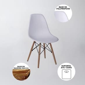 Cadeiras Eames Eiffel: Com assento em policarbonato de alta resistência, as cadeiras oferecem conforto e durabilidade. A base em madeira maciça garante estabilidade e suporte de até 120kg, além de adicionar um charme rústico e aconchegante ao seu espaço.