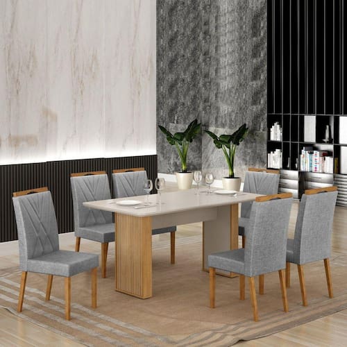 O conjunto Mesa Julia com 6 cadeiras combina elegância e conforto para a sua sala de jantar. A mesa oferece um design clássico e espaçoso, ideal para refeições em família. As cadeiras, com estofamento macio, proporcionam uma experiência de jantar agradável. Juntos, oferecem funcionalidade e estilo para sua casa. Medida da Mesa (A x L x P): 78cmx160cmx80cm Peso da Mesa: 52,6 kg Mesa suporta até: 40.0000 Acabamento da Cadeira/Banco: Pintura UV Acabamento da Mesa: Pintura UV Acompanha Manual de Instalação: Sim Almofada do assento: Fixa Almofada do encosto: Fixa Ambiente Principal: Sala de Jantar Cadeira/Banco estofada: Sim Cadeira/Banco suporta até: 120.0000 codigo_ean: 7909903573952 Complexidade da Montagem: Média: pode ser montado por mais de uma pessoa e/ou necessite de maior conhecimento para montagem Cor: Cinamomo/Off White/Prata Linho Cor do Produto: Cinamomo/Off White/Prata Linho Enchimento do Assento: Espuma D-23 Enchimento do Encosto: Espuma D-18 Escala de Brilho: Fosco Espessura do Tampo: 4 mm Estrutura do Assento: Madeira Itens Inclusos: 1 mesa Julia com 6 cadeiras Lara, manual de montagem e kit ferragens Manual de Montagem e Instalação: https://product-hub-prd.madeiramadeira.com.br/891883/documents/10562ae3-1a91-46e5-ba30-d3b43626f90b520mesajuliacomcadeiralara.pdf Material da Base da Mesa: MDF/MDP Material da Estrutura da Cadeira: Madeira Maciça Material do Tampo: Vidro Material Principal: MDF/MDP Medida da Cadeira/Banco (A x L x P): 97cmx45cmx60cm Medida do Tampo (L x C x E): 78cmx160cmx2,5cm Mesa Dobrável: Não Mesa Extensível: Não Necessita Montagem: Sim Origem do Produto: Nacional Peso da Cadeira/Banco: 10,5 kg Possui Apoio para Braços: Não Possui Apoio Para os Pés: Não Possui Prateleiras: Não Possui Suporte Giratório: Não Possui Vidro: Sim Quantidade de Cadeiras: 6 Quantidade de Lugares: 06 Recomendações de Uso, Manutenção e Limpeza: Para limpeza utilizar apenas um pano úmido. Revestimento da Cadeira/Banco: Linho Sistema de Montagem: Parafusos Tipo de Assento: Fixo Tipo de Encosto: Fixo Vidro Temperado: Sim