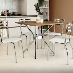 Para todos os espaços, aposte no conjunto CMC790 da Kappesberg. Em estrutura metálica cromada, a mesa conta com estrutura tubular circular, e com uma travessa central, os pés são dispostos em "K". Medindo 80,5cm de altura e 60cm de largura e profundidade, combinada com o tampo quadrado F090, em chapa MDP de 25mm e pintura touch na cor nogueira, ele possui pontas chanfradas e acomoda até quatro pessoas. Já as cadeiras, no modelo Portugal, também em estrutura metálica cromada, medindo 87,5cm de altura, sendo 46cm a altura do assento, suportam até 130kg, garantindo estabilidade e resistência. E para mais comodidade, o assento é estofado e recoberto com sintético na cor branca. Já o encosto, garante um encaixe perfeito com as costas, proporcionando conforto ao produto.