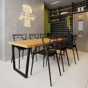 Transforme sua casa ou escritório em um espaço moderno e elegante com o conjunto de mesa Lana industrial e cadeiras alegra. Combinando o charme rústico da estética industrial com a funcionalidade contemporânea, este conjunto é uma escolha ideal para quem busca uma atmosfera única e convidativa.