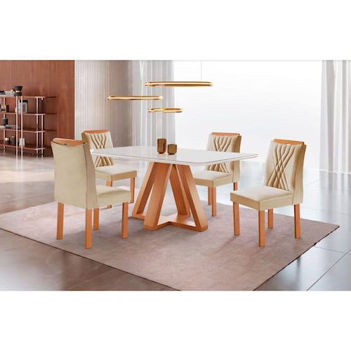 Buscando por móveis de qualidade e beleza? Então você vai se apaixonar por esta lindíssima com o Conjunto Mesa de Jantar Madri. Confeccionada com MDF de alta durabilidade, ela possui tampo de vidro e o visual que vai deixar sua sala de jantar simplesmente irresistível. Os almoços de domingo estão prestes a ficar ainda mais prazerosos!