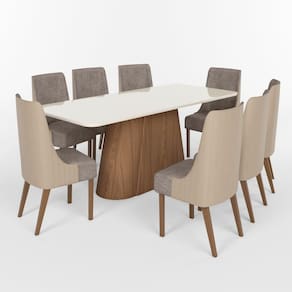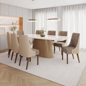 O conjunto sala de Jantar Olívia possui tampo de 200 centímetros de comprimento com 90 cm de largura e 2,5cm de espessura, os cantos são arredondados, a pintura é laqueada além dele ter a mesma pintura na parte de baixo também. O Vidro possui 4mm de espessura e conta com acabamento arredondado seguindo o padrão do tampo. O Layout da base Olívia em trapézio com as extremidades arredondadas é bem moderno. A mesa conta com 8 cadeiras lvy. Beleza originalidade durabilidade. Medida da Mesa (A x L x P): 80 x 200 x 100cm Peso da Mesa: 70 kg Mesa suporta até: 40 kg Acabamento da Cadeira/Banco: Pintura UV Acabamento da Mesa: Pintura UV Almofada do assento: Fixa Ambiente Principal: Sala de Jantar Cadeira/Banco Estofada: Encosto e Assento Estofados Cadeira/Banco estofada: Encosto e Assento Estofados Cadeira/Banco Suporta Até: 120.0000 Cadeira/Banco suporta até: 120 kg codigo_ean: 7900288295064 Complexidade da Montagem: Alta: deve ser montado por um montador especializado Cor: Marrom/ Off White / Bege/ Cacao Cor do Produto: Marrom/ Off White / Bege/ Cacao Cor Secundária: Marrom De Canto (Canto Alemão): Não Enchimento do Assento: Espuma D-23 Escala de Brilho: Fosco Espessura do Tampo: 25 mm Estrutura do Assento: MDF/MDP Formato do Tampo: Retangular Itens Inclusos: 1 Mesa, 8 Cadeiras, Kit Ferragens e Manual de Montagem Linha ou Coleção: Olívia/Ivy Manual de Montagem e Instalação: https://product-hub-prd.madeiramadeira.com.br/274719849/documents/deafd324-af59-4c16-91a1-5f4321bfd129332717932661763148251676.pdf Marca: Henn Material da Base da Mesa: MDF Material da Estrutura da Cadeira: MDF/MDP Material do Tampo: Vidro/MDF Material Principal: MDF/MDP Medida da Cadeira/Banco (A x L x P): 97 x 47 x 64cm Medida do Tampo (L x C x E): 200 x 100 x 2,5cm Mesa Extensível: Sim Necessita Montagem: Sim Origem do Produto: Nacional Peso da Cadeira/Banco: 8 kg Possui Apoio Para os Pés: Não Quantidade de Cadeiras: 8 Quantidade de Lugares: 08 Recomendações de Uso, Manutenção e Limpeza: Para limpeza de seu móvel, use uma flanela seca ou umedecida. Não utilize produtos químicos que possam danificar o produto. Revestimento da Cadeira/Banco: Linho Sistema de Montagem: Parafusos e Cavilhas