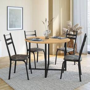 O Conjunto de Mesa Leia com 4 cadeiras possui design moderno que se adapta a qualquer ambiente. Contém tampo redondo em BP resistente a riscos, manchas e umidade, e as cadeiras são revestidas em tecido sintético de fácil limpeza. Ainda conta com base da mesa e cadeiras em aço, garantindo resistência e durabilidade.