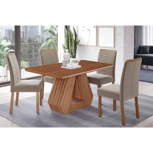 Sala Jantar Mesa Ágata Tampo Madeirado 130x80cm e 4 Cadeiras Clarice Cinamomo - Carvalho/Suede Joli Capuccino - Cimol