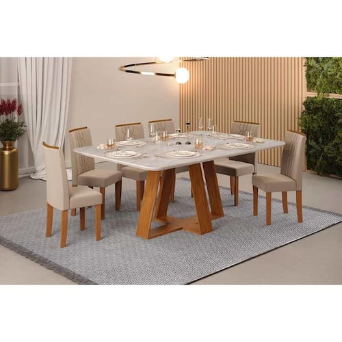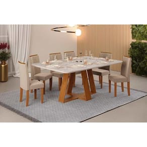 Sala de Jantar Completa Celeste c/ Tampo Madeirado Retangular 170x90cm e 6 Cadeiras Zoe Freijo/Quartzo - Suede Creme - DJ Móveis