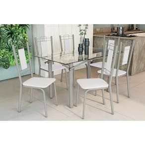 Sala de Jantar Completa Elba c/ Tampo de Vidro 140cm e 6 Cadeiras Florença Niquel - Courano Branco - Kappesberg Abaixo segue os produtos do KIT: Sala de Jantar Completa Elba c/ Tampo de Vidro 140cm e 6 Cadeiras Florença Niquel - Courano Branco - Kappesberg