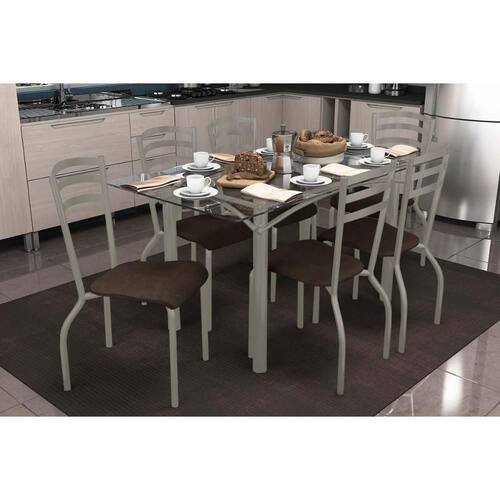 Conjunto: Mesa Sala Jantar Elba C/ Tampo De Vidro 150cm E 6 Cadeiras Portugal Niquel - Courano Marrom - Kappesberg