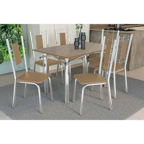 Sala de Jantar Completa Elba Tampo Madeirado c/ Vidro 120cm e 6 Cadeiras Florença Cromada/Freijo Bronze - Courano Capuccino - Kappesberg