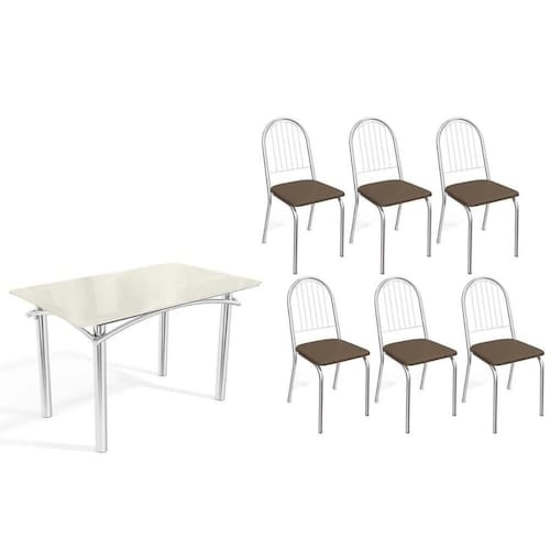 Abaixo segue os produtos do KIT: Sala de Jantar Completa Elba Tampo Madeirado c/ Vidro 120cm e 6 Cadeiras Noruega Cromada/Off White - Courano Marrom - Kappesberg