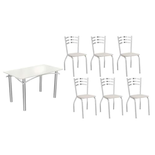 Sala de Jantar Completa Elba Tampo Madeirado c/ Vidro 120cm e 6 Cadeiras Portugal Cromada/Off White - Courano Branco - Kappesberg Abaixo segue os produtos do KIT: Sala de Jantar Completa Elba Tampo Madeirado c/ Vidro 120cm e 6 Cadeiras Portugal Cromada/Off White - Courano Branco - Kappesberg
