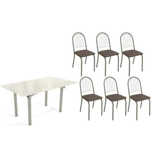 Sala de Jantar Completa Elba Tampo Madeirado c/ Vidro 160cm e 6 Cadeiras Noruega Niquel/Off White - Courano Marrom - Kappesberg