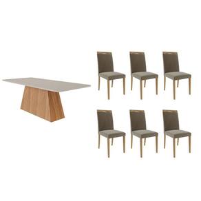 Conjunto: Mesa Sala Jantar Helena c/ Tampo Madeirado c/ Vidro 210x100 cm e 6 Cadeiras Laura Madeirado/Suede Joli Capuccino - Cimol - Conjunto de Mesa de Jantar Cimol com 6 Cadeiras