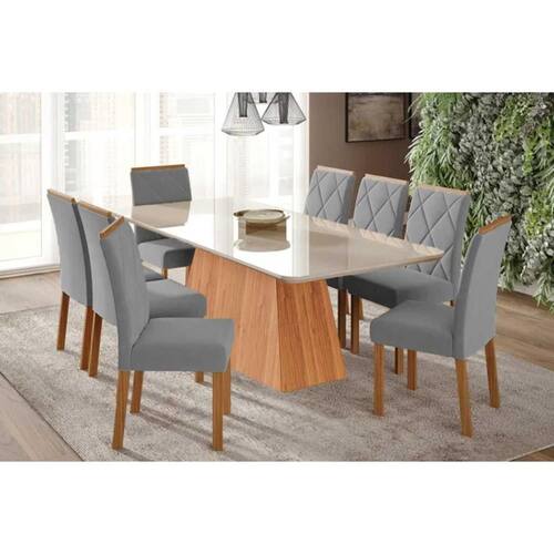 Sala Jantar Mesa Helena Tampo Madeirado c/ Vidro 210x100cm e 8 Cadeiras Fernanda Cinamomo/Off White - Carvalho/Linho Grafite - Cimol