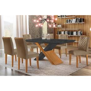 Conjunto: Mesa Sala Jantar Imperatriz Tampo Madeirado c/ Vidro Canto Curvo 180x90 e 6 Cadeiras Jade Imbuia/Grafite - Suede Capuccino - Rufato - Blush