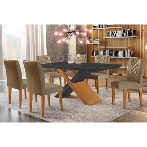 Abaixo segue os produtos do KIT: Sala de Jantar Completa Imperatriz Tampo Madeirado c/ Vidro Canto Curvo 180x90 e 6 Cadeiras Jade Imbuia/Grafite - Suede Capuccino - Rufato