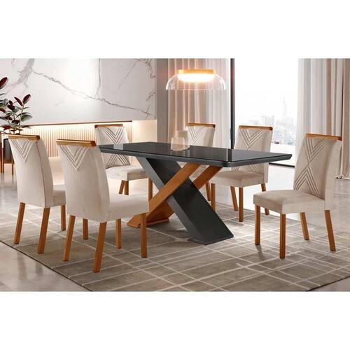 Sala de Jantar Completa Imperatriz Tampo Madeirado c/ Vidro Curvo 180x90 e 6 Cadeiras Amsterdã Imbuia/Suede Creme - Rufato
