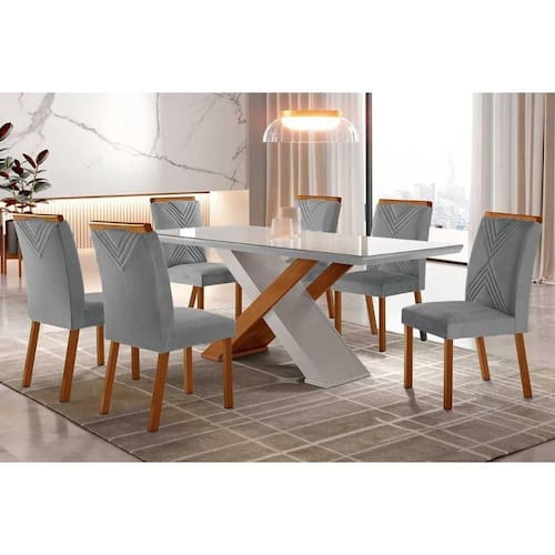 Sala de Jantar Completa Imperatriz Tampo Madeirado c/ Vidro Reto 180x90 e 6 Cadeiras Amsterdã Imbuia/Off White - Suede Grafite - Rufato