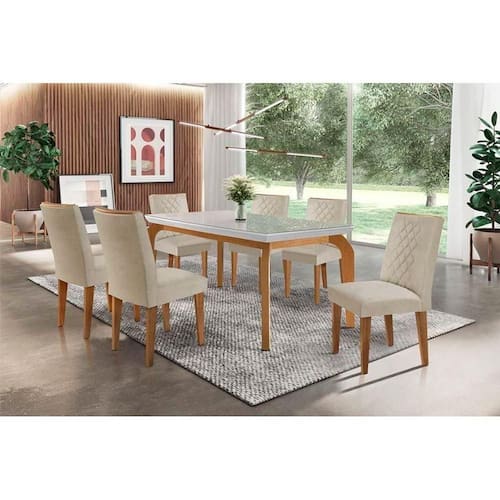 Abaixo segue os produtos do KIT: Sala de Jantar Completa Londrina Tampo Madeirado c/ Vidro 180x90cm e 6 Cadeiras Jade Imbuia/Bege Turim - Rufato