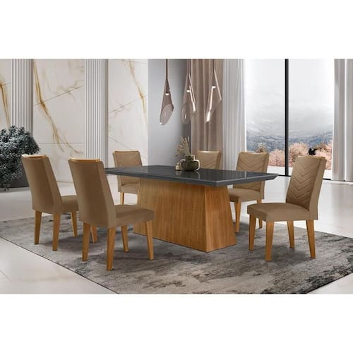 Sala de Jantar Completa Luna c/ Tampo de Vidro Canto Curvo 180x90cm e 6 cadeiras Londrina Imbuia/Grafite - Suede Capuccino - Rufato Abaixo segue os produtos do KIT: Sala de Jantar Completa Luna c/ Tampo de Vidro Canto Curvo 180x90cm e 6 cadeiras Londrina Imbuia/Grafite - Suede Capuccino - Rufato