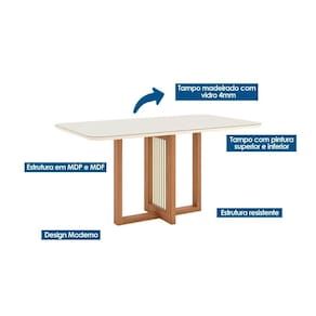 Mesa de Sala Jantar Natalí SC71 c/ Tampo Madeirado c/ Vidro Curvo 160x90cm Nature/Off White - Henn