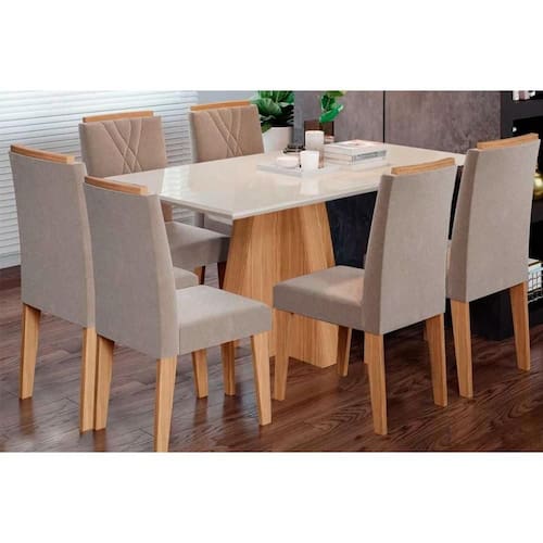 Sala de Jantar Completa Patricia c/ Tampo Madeirado c/ Vidro Canto Reto 160x80cm e 6 Cadeiras Nicole Nature/Linho Bege - Cimol