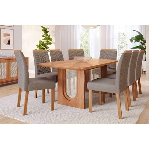 Sala de Jantar Completa Valentina c/ Tampo Madeirado 210x100cm e 8 Cadeiras Clarice Cinamomo - Carvalho/Linho Bege - Cimol Abaixo segue os produtos do KIT: Sala de Jantar Completa Valentina c/ Tampo Madeirado 210x100cm e 8 Cadeiras Clarice Cinamomo - Carvalho/Linho Bege - Cimol