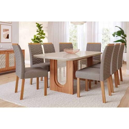 Sala Jantar Mesa Valentina Curvo 210cm + 8 Cadeiras Clarice Cinamomo/Off White - Carvalho/Linho Bege - Cimol