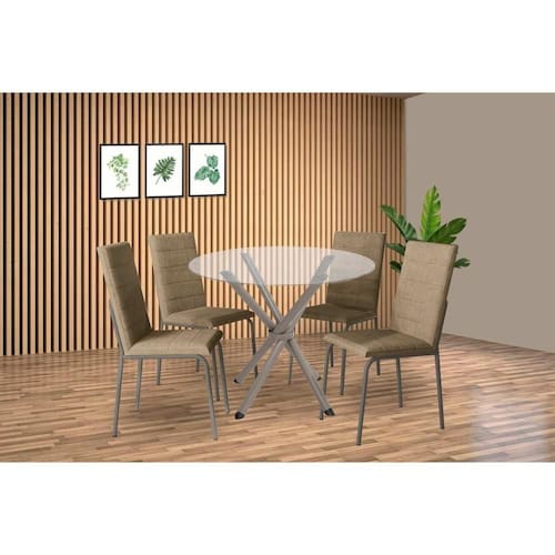 Sala de Jantar Completa Volga c/ Tampo de Vidro 95cm e 4 Cadeiras Amsterdã Niquel - Courano Capuccino - Kappesberg Abaixo segue os produtos do KIT: Sala de Jantar Completa Volga c/ Tampo de Vidro 95cm e 4 Cadeiras Amsterdã Niquel - Courano Capuccino - Kappesberg