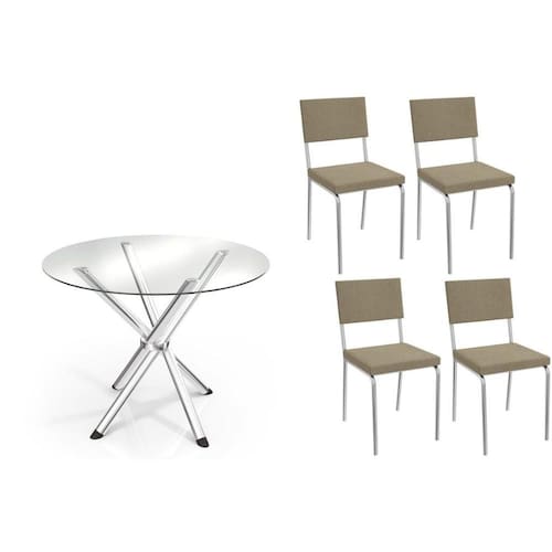 Sala de Jantar Completa Volga c/ Tampo de Vidro 95cm e 4 Cadeiras Zaria Cromada - Boucle Bege - Kappesberg Abaixo segue os produtos do KIT: Sala de Jantar Completa Volga c/ Tampo de Vidro 95cm e 4 Cadeiras Zaria Cromada - Boucle Bege - Kappesberg