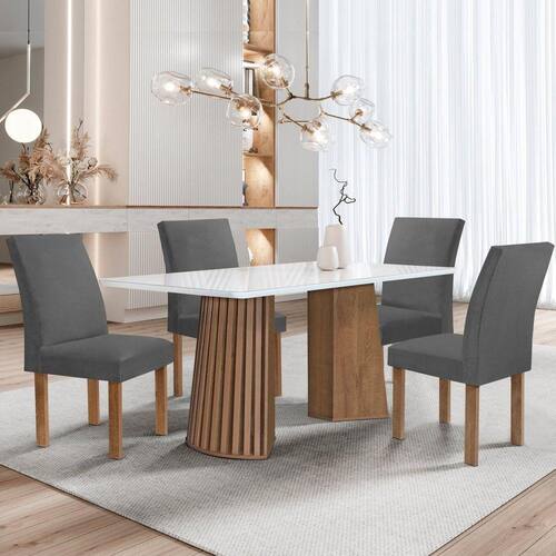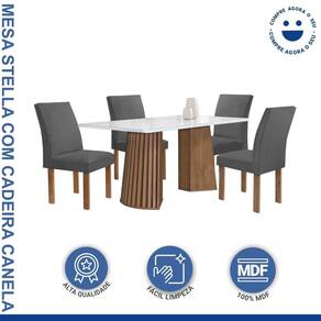 Renove sua sala de jantar com o conjunto Mesa Stella, acompanhado por quatro cadeiras. A mesa tem um visual moderno, com linhas suaves e elegantes. As cadeiras são confortáveis e têm um estilo sofisticado. Juntos, eles fazem da sua sala de jantar um lugar especial para reunir a família e os amigos. Medida da Mesa (A x L x P): 79cmx120cmx90cm Peso da Mesa: 56,4 kg Mesa suporta até: 40.0000 Acabamento da Cadeira/Banco: Pintura Acabamento da Mesa: Pintura UV Acompanha Manual de Instalação: Sim Almofada do assento: Fixa Ambiente Principal: Sala de Jantar Cadeira/Banco estofada: Encosto e Assento Estofados Cadeira/Banco Estofada: Encosto e Assento Estofados Cadeira/Banco suporta até: 120.0000 codigo_ean: 7909903599389 Complexidade da Montagem: Alta: deve ser montado por um montador especializado Cor: Chocolate/Off White/Veludo Cinza Cor do Produto: Chocolate/Off White/Veludo Cinza De Canto (Canto Alemão): Não Design da Base: Pedestal Enchimento do Assento: Espuma D-23 Enchimento do Encosto: Espuma D-20 Escala de Brilho: Fosco Espessura do Tampo: 29 mm Estrutura do Assento: MDF Estrutura do Encosto: MDF Formato do Tampo: Retangular Itens Inclusos: 1 Mesa Stella com 4 cadeiras e manual de montagem Linha ou Coleção: Stella Manual de Montagem e Instalação: https://product-hub-prd.madeiramadeira.com.br/895923/documents/01f1ae1a-1ea1-4110-8826-f9a885961959A20NEVADA20CADEIRA20NAPOLE.pdf Material da Base da Mesa: MDF Material da Estrutura da Cadeira: MDF Material do Tampo: Vidro/MDF Material Principal: MDF Material Principal das Cadeiras/Bancos: MDF Medida da Cadeira/Banco (A x L x P): 96,5cmx56cmx44cm Medida do Tampo (L x C x E): 120cmx90cmx2,9cm Mesa Dobrável: Não Mesa Extensível: Não Necessita Montagem: Sim Origem do Produto: Nacional Peso da Cadeira/Banco: 9,1 kg Possui Apoio para Braços: Não Possui Apoio Para os Pés: Não Possui Prateleiras: Não Possui Suporte Giratório: Não Possui Vidro: Sim Quantidade de Cadeiras: 4 Quantidade de Lugares: 04 Recomendações de Uso, Manutenção e Limpeza: Limpar apenas com pano úmido. Revestimento da Cadeira/Banco: Veludo Sistema de Montagem: Parafusos Tipo de Assento: Fixo Tipo de Encosto: Fixo