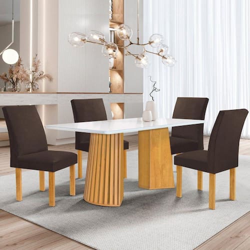 Renove sua sala de jantar com o conjunto Mesa Stella, acompanhado por quatro cadeiras. A mesa tem um visual moderno, com linhas suaves e elegantes. As cadeiras são confortáveis e têm um estilo sofisticado. Juntos, eles fazem da sua sala de jantar um lugar especial para reunir a família e os amigos. Medida da Mesa (A x L x P): 79cmx120cmx90cm Peso da Mesa: 56,4 kg Mesa suporta até: 40.0000 Acabamento da Cadeira/Banco: Pintura Acabamento da Mesa: Pintura UV Acompanha Manual de Instalação: Sim Almofada do assento: Fixa Ambiente Principal: Sala de Jantar Cadeira/Banco estofada: Encosto e Assento Estofados Cadeira/Banco Estofada: Encosto e Assento Estofados Cadeira/Banco suporta até: 120.0000 codigo_ean: 7909903599426 Complexidade da Montagem: Alta: deve ser montado por um montador especializado Cor: Cinamomo/Off White/Veludo Marrom Cor do Produto: Cinamomo/Off White/Veludo Marrom De Canto (Canto Alemão): Não Design da Base: Pedestal Enchimento do Assento: Espuma D-23 Enchimento do Encosto: Espuma D-20 Escala de Brilho: Fosco Espessura do Tampo: 29 mm Estrutura do Assento: MDF Estrutura do Encosto: MDF Formato do Tampo: Retangular Itens Inclusos: 1 Mesa Stella com 4 cadeiras e manual de montagem Linha ou Coleção: Stella Manual de Montagem e Instalação: https://product-hub-prd.madeiramadeira.com.br/895928/documents/3b333b9e-9764-4444-8ac8-985036928d96A20NEVADA20CADEIRA20NAPOLE.pdf Material da Base da Mesa: MDF Material da Estrutura da Cadeira: MDF Material do Tampo: Vidro/MDF Material Principal: MDF Material Principal das Cadeiras/Bancos: MDF Medida da Cadeira/Banco (A x L x P): 96,5cmx56cmx44cm Medida do Tampo (L x C x E): 120cmx90cmx2,9cm Mesa Dobrável: Não Mesa Extensível: Não Necessita Montagem: Sim Origem do Produto: Nacional Peso da Cadeira/Banco: 9,1 kg Possui Apoio para Braços: Não Possui Apoio Para os Pés: Não Possui Prateleiras: Não Possui Suporte Giratório: Não Possui Vidro: Sim Quantidade de Cadeiras: 4 Quantidade de Lugares: 04 Recomendações de Uso, Manutenção e Limpeza: Limpar apenas com pano úmido. Revestimento da Cadeira/Banco: Veludo Sistema de Montagem: Parafusos Tipo de Assento: Fixo Tipo de Encosto: Fixo