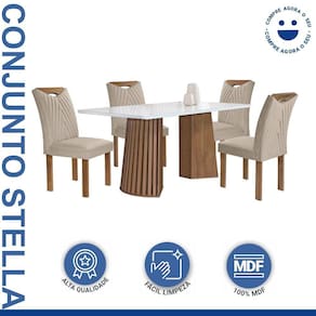 Renove sua sala de jantar com o conjunto Mesa Stella, acompanhado por quatro cadeiras. A mesa tem um visual moderno, com linhas suaves e elegantes. As cadeiras são confortáveis e têm um estilo sofisticado. Juntos, eles fazem da sua sala de jantar um lugar especial para reunir a família e os amigos. Medida da Mesa (A x L x P): 79cmx120cmx90cm Peso da Mesa: 56,4 kg Mesa suporta até: 40.0000 Acabamento da Cadeira/Banco: Pintura Acabamento da Mesa: Pintura UV Acompanha Manual de Instalação: Sim Almofada do assento: Fixa Ambiente Principal: Sala de Jantar Cadeira/Banco estofada: Encosto e Assento Estofados Cadeira/Banco Estofada: Encosto e Assento Estofados Cadeira/Banco suporta até: 120.0000 codigo_ean: 7909903599266 Complexidade da Montagem: Alta: deve ser montado por um montador especializado Cor: Chocolate/Off White/Boucle Bege Cor do Produto: Chocolate/Off White/Boucle Bege De Canto (Canto Alemão): Não Design da Base: Cilindro Enchimento do Assento: Espuma D-23 Enchimento do Encosto: Espuma D-20 Escala de Brilho: Fosco Espessura do Tampo: 29 mm Estrutura do Assento: MDF Estrutura do Encosto: MDF Formato do Tampo: Retangular Itens Inclusos: 1 Mesa Stella com 4 cadeiras e manual de montagem Linha ou Coleção: Stella Manual de Montagem e Instalação: https://product-hub-prd.madeiramadeira.com.br/895910/documents/45c4d4fd-1bfa-43d1-8ae1-c37752be52b3A20NEVADA20CADEIRA20NEVADA.pdf Material da Base da Mesa: MDF Material da Estrutura da Cadeira: MDF Material do Tampo: Vidro/MDF Material Principal: MDF Material Principal das Cadeiras/Bancos: MDF Medida da Cadeira/Banco (A x L x P): 96,5cmx56cmx44cm Medida do Tampo (L x C x E): 120cmx90cmx2,9cm Mesa Dobrável: Não Mesa Extensível: Não Necessita Montagem: Sim Origem do Produto: Nacional Peso da Cadeira/Banco: 9,1 kg Possui Apoio para Braços: Não Possui Apoio Para os Pés: Não Possui Prateleiras: Não Possui Suporte Giratório: Não Possui Vidro: Sim Quantidade de Cadeiras: 4 Quantidade de Lugares: 04 Recomendações de Uso, Manutenção e Limpeza: Limpar apenas com pano úmido. Revestimento da Cadeira/Banco: Veludo Sistema de Montagem: Parafusos Tipo de Assento: Fixo Tipo de Encosto: Fixo