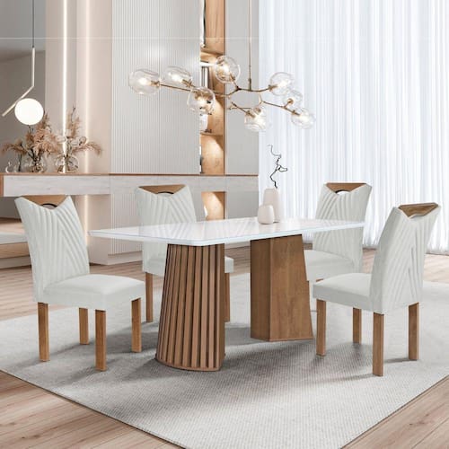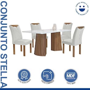Renove sua sala de jantar com o conjunto Mesa Stella, acompanhado por quatro cadeiras. A mesa tem um visual moderno, com linhas suaves e elegantes. As cadeiras são confortáveis e têm um estilo sofisticado. Juntos, eles fazem da sua sala de jantar um lugar especial para reunir a família e os amigos. Medida da Mesa (A x L x P): 79cmx120cmx90cm Peso da Mesa: 56,4 kg Mesa suporta até: 40.0000 Acabamento da Cadeira/Banco: Pintura Acabamento da Mesa: Pintura UV Acompanha Manual de Instalação: Sim Almofada do assento: Fixa Ambiente Principal: Sala de Jantar Cadeira/Banco estofada: Encosto e Assento Estofados Cadeira/Banco Estofada: Encosto e Assento Estofados Cadeira/Banco suporta até: 120.0000 codigo_ean: 7909903599259 Complexidade da Montagem: Alta: deve ser montado por um montador especializado Cor: Chocolate/Off White/Boucle Gelo Cor do Produto: Chocolate/Off White/Boucle Gelo De Canto (Canto Alemão): Não Design da Base: Cilindro Enchimento do Assento: Espuma D-23 Enchimento do Encosto: Espuma D-20 Escala de Brilho: Fosco Espessura do Tampo: 29 mm Estrutura do Assento: MDF Estrutura do Encosto: MDF Formato do Tampo: Retangular Itens Inclusos: 1 Mesa Stella com 4 cadeiras e manual de montagem Linha ou Coleção: Stella Manual de Montagem e Instalação: https://product-hub-prd.madeiramadeira.com.br/895909/documents/7a07333f-0778-496d-b7f2-e4808fc96b2fA20NEVADA20CADEIRA20NEVADA.pdf Material da Base da Mesa: MDF Material da Estrutura da Cadeira: MDF Material do Tampo: Vidro/MDF Material Principal: MDF Material Principal das Cadeiras/Bancos: MDF Medida da Cadeira/Banco (A x L x P): 96,5cmx56cmx44cm Medida do Tampo (L x C x E): 120cmx90cmx2,9cm Mesa Dobrável: Não Mesa Extensível: Não Necessita Montagem: Sim Origem do Produto: Nacional Peso da Cadeira/Banco: 9,1 kg Possui Apoio para Braços: Não Possui Apoio Para os Pés: Não Possui Prateleiras: Não Possui Suporte Giratório: Não Possui Vidro: Sim Quantidade de Cadeiras: 4 Quantidade de Lugares: 04 Recomendações de Uso, Manutenção e Limpeza: Limpar apenas com pano úmido. Revestimento da Cadeira/Banco: Veludo Sistema de Montagem: Parafusos Tipo de Assento: Fixo Tipo de Encosto: Fixo